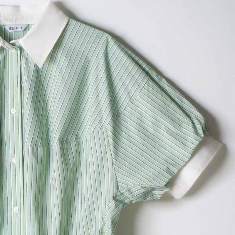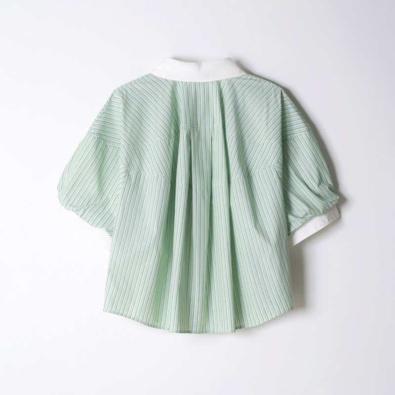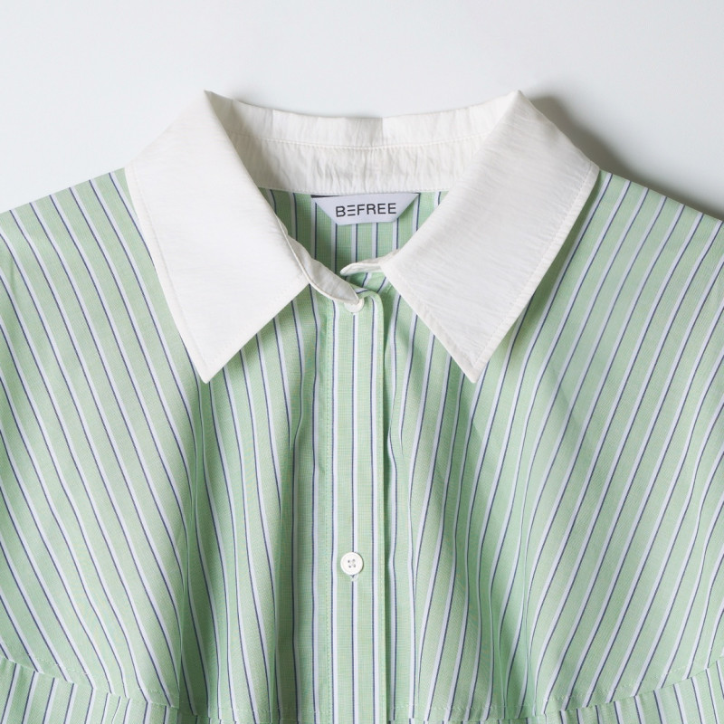 - 산뜻한 민트 컬러와 세련된 스트라이프 패턴이 돋보이는 배색 카라 블라우스입니다.