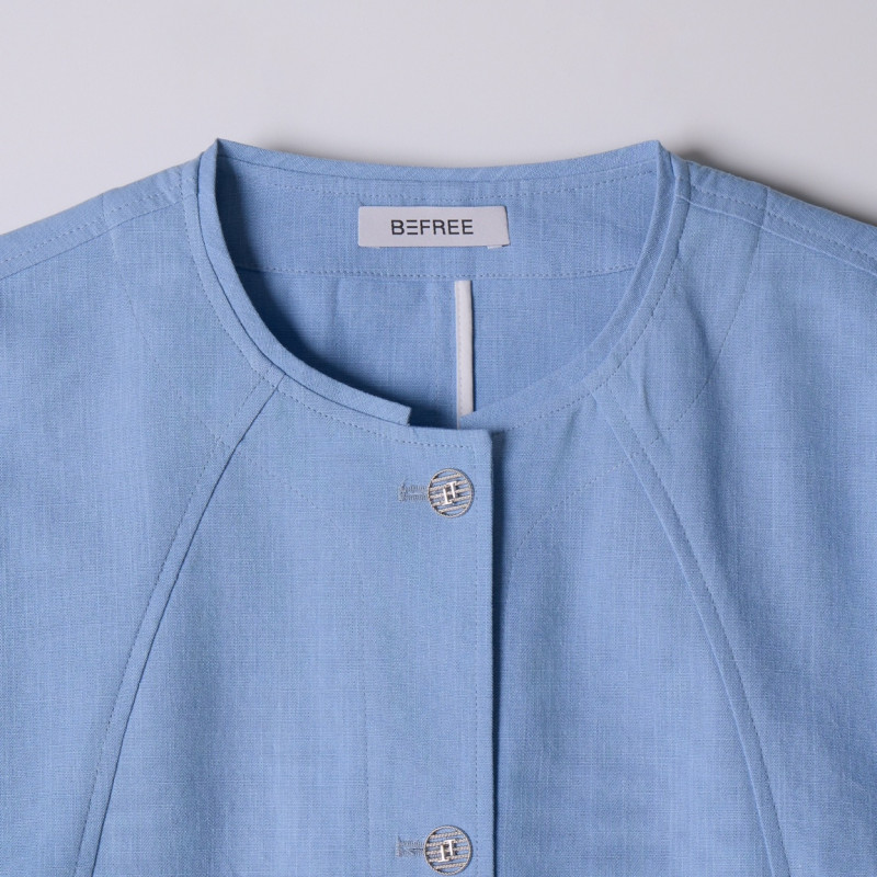 - 깔끔한 노카라 디자인과 앞면 버튼, 넉넉한 포켓이 특징입니다.
