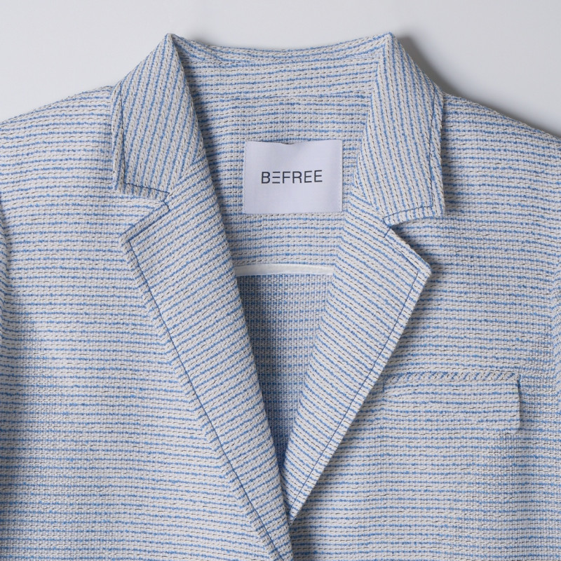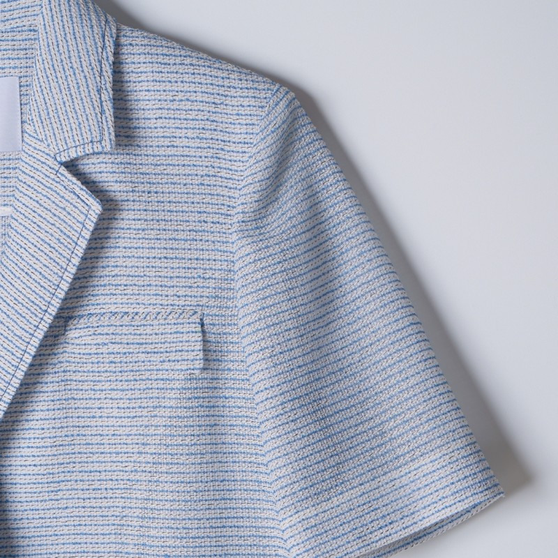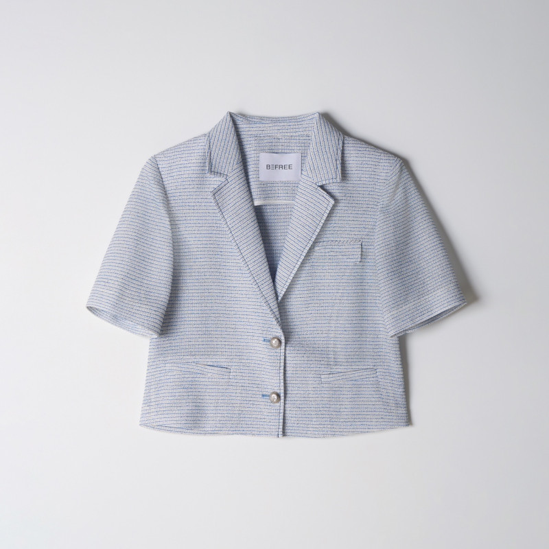 ​- 시원한 컬러감의 스트라이프 패턴이 돋보이는 여름 트위드 반팔 자켓입니다.